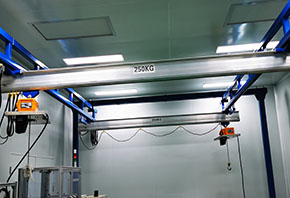 孚尔特组合式悬挂起重机,起重量500KG,主梁长6m,固定型轨长8m,起升高度3.5m,配套 智能提升装置。替代选择:客户之前使用普通电动葫芦吊装,难以准确对位,效率低下,费时费力。为何选择孚尔特